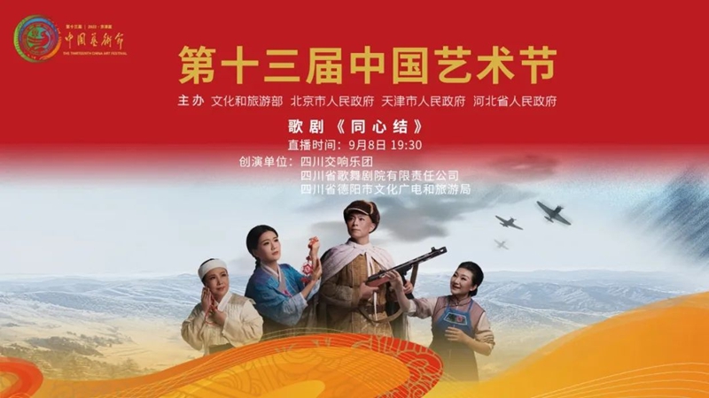 2022年9月8日、9日,由四川省文化和旅游厅出品、四川交响乐团、四川省歌舞剧院有限责任公司、德阳市文化广播电视和旅游局联合演出的经典民族歌剧《同心结》,作为第十三届中国艺术节唯一一部歌颂“抗美援朝保家卫国伟大精神”为主题的参演剧目,在北京保利剧院成功上演,并于9月8日进行了线上同步直播,线上线下的广大观众,在深情的歌声、动人的旋律、出神入化的表演中,感受着以英雄黄继光为代表的中国人民志愿军所体现的伟大爱国主义精神。