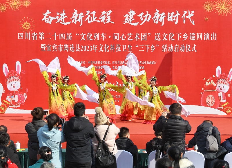 一辆“文化列车”开进宜宾市筠连县,将欢声笑语撒向广袤的田野,用歌舞汇聚奋进的力量。1月30日,四川省第二十四届“文化列车·同心艺术团”送文化下乡巡回演出暨宜宾市筠连县2023年文化科技卫生“三下乡”活动启动仪式在宜宾市筠连县举行。此次活动由中共四川省委宣传部、四川省交通运输厅、四川省文化和旅游厅主办,中共宜宾市委宣传部、宜宾市文化广播电视和旅游局、中共筠连县委、筠连县人民政府承办。