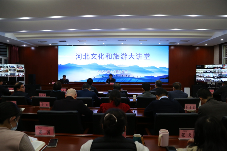 11月28日下午,省文化和旅游厅举办2023年第5期“河北文化和旅游大讲堂”。此次大讲堂,邀请中国旅游研究院院长戴斌主讲,厅党组成员、副厅长杨军主持,厅机关和省文物局全体干部,厅属事业单位处级以上干部,各市(含定州、辛集市)文化和旅游部门、雄安新区宣传网信局负责同志和相关部门人员,市县文旅企业、旅游景区负责人,共计2200余人听取专题讲座。讲座采取视频连线方式举行,主会场设在厅机关,在厅属各单位和各市、县(区、市)文旅部门设分会场。