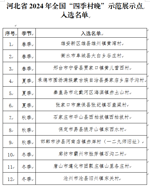 近日,文化和旅游部公布了2024年全国“四季村晚”示范展示点。我省雄安新区雄县雄州镇黄湾村、石家庄市平山县西柏坡镇西柏坡村、承德市围场满族蒙古族自治县姜家店乡庙子沟村、廊坊市霸州市胜芳镇石沟二村等12个地区入选全国“四季村晚”示范展示点。