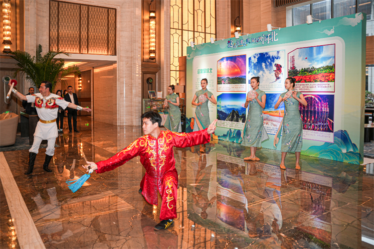 活动现场,设置了河北非遗文创精品展,展示了铁板浮雕、井陉木雕、滕式布糊画、蔚县剪纸、唐山皮影、保定京绣等河北非遗文创产品200余件,同时,进一步宣传推广“多彩旅行·畅游河北”系列活动,让更多游客跟着微短剧、诗词、赛事、国宝、演艺、非遗等主题畅游河北,此外,现场还组织杂技、舞蹈等快闪表演,以“文化拼盘”方式,全方位、立体化、沉浸式展示河北文旅,吸引了众多与会人员驻足观赏。