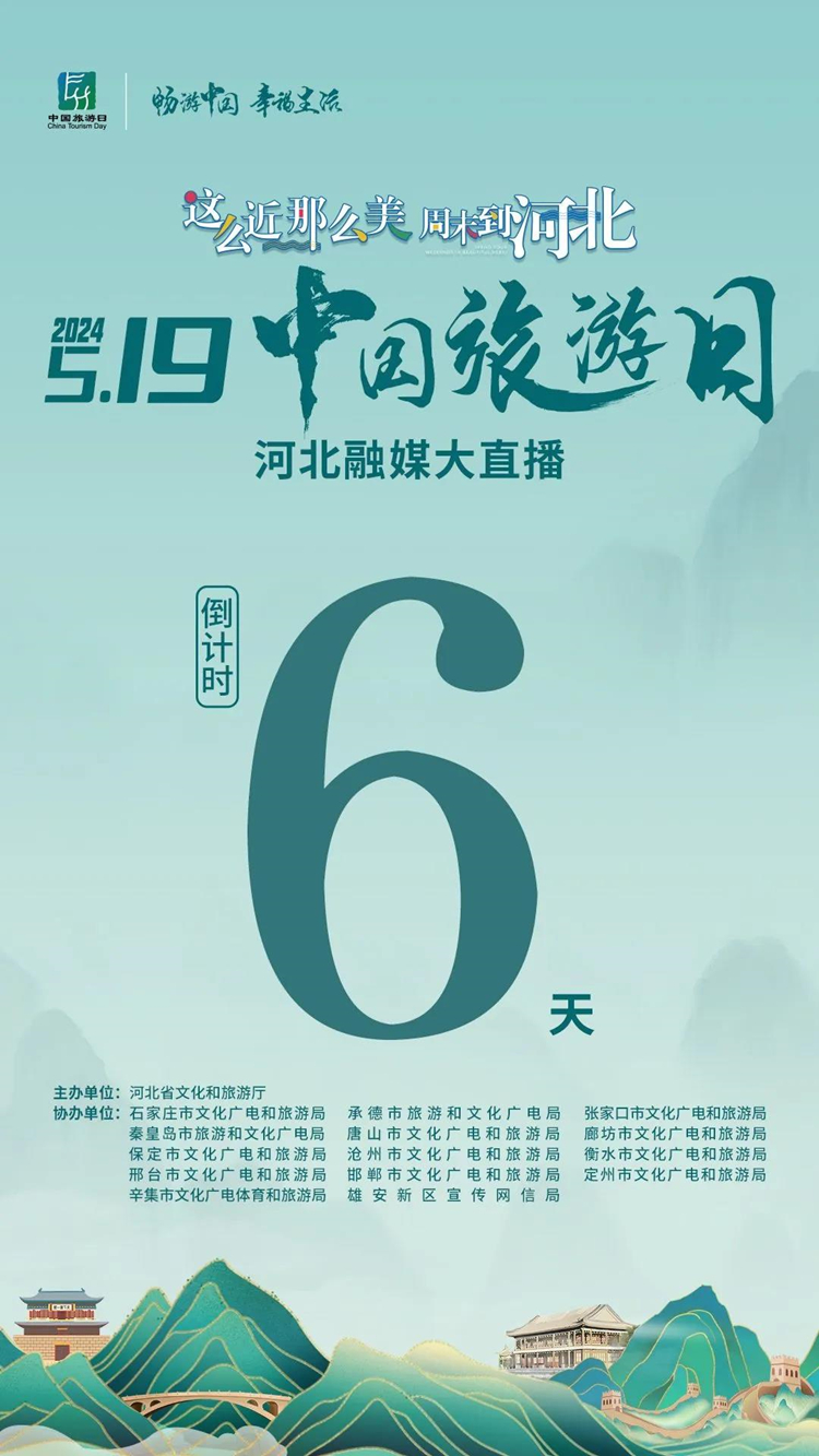 2024年5月19日是第14个“中国旅游日”。为营造浓厚热烈的旅游日节日氛围,实现全民共享、全员参与,更好推动全省文化和旅游业高质量发展,河北省文化和旅游厅主办、各地市联合参与开展“这么近,那么美,周末到河北”——2024“5·19中国旅游日”河北融媒大直播活动。