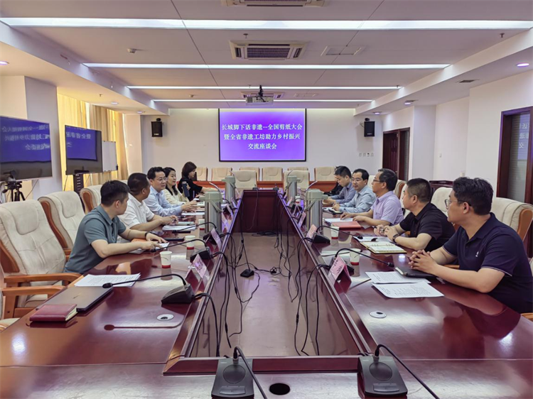 在随后召开的座谈会上,李新杰指出,“长城脚下话非遗”活动是省文化和旅游厅深入推动长城国家文化公园、京张体育文化旅游带建设,助力乡村振兴战略的重要宣传展示平台,到今年将是第四届,已经成为了我省的重要文化活动品牌。本次活动的主要内容是非遗助力乡村振兴暨全国剪纸文化大会。一是举办全国非遗助力乡村振兴交流活动。通过召开全国现场会,探讨非遗项目在带动地方群众就业增收,巩固脱贫成果,助力乡村振兴过程中的实践经验,形成可复制、可借鉴、可推广的工作模式,进一步建设提升非遗工坊。二是以联合国人类非遗项目“中国剪纸”为主题,组织全国剪纸类非遗项目在蔚县进行展示交流、项目履约情况研讨,挖掘推介剪纸项目在非遗助力乡村振兴和非遗与旅游融合发展方面的路径和典型案例。