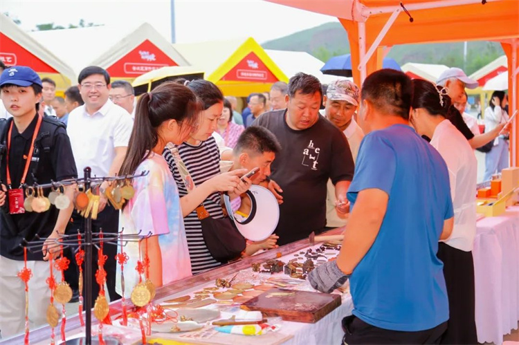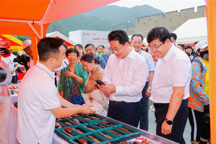 在大好河山张家口的大境门北广场,锣鼓喧天、龙舞翩翩,五位非遗代表性传承人击鼓启动活动,在这里,“非遗耀长城”长城沿线非遗助力乡村振兴成果展吸引了观众的目光。近百个展位汇聚了长城沿线15个省区市各级非遗代表性项目、河北省传统工艺高质量发展“双百计划”成果、张家口乡村振兴特色产品等多项内容,北京景泰蓝瑰丽、花丝镶嵌精致,天津葫芦匠心独运、胡连庄杨氏柳编灵巧,河北玉田泥塑憨态可掬,涿州蛋雕细腻入微……游客们纷纷驻足观赏来自各省市的非遗工坊品牌产品。
