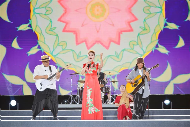 歌会现场,歌唱艺术家于文华、王洁实、魏伽妮、王晓娟等倾情献唱,精彩演绎了《在希望的田野上》《纤夫的爱》《外婆的澎湖湾》《爱》《请跟我来》《小河淌水》等经典歌曲,为广大乐迷带来了精彩纷呈、形式多样的歌会,获得了现场阵阵掌声和欢呼。同时,来自草原的东方神骏乐团带着非遗马头琴表演、华阴老腔表演团带着“黄土高原上的摇滚乐”,来到现场,为大会增彩、为七夕助兴。劲爆的乐曲、“带感”的节奏响起,正当台下观众跟着摇滚乐打着节拍轻舞,“曲风”一变,河北民歌《回娘家》熟悉的旋律合着摇滚乐入耳来。在架子鼓、电吉他的“呼应”下,民歌有了新表达。浓郁国风摇滚也让现场年轻人不由自主跟着舞动。