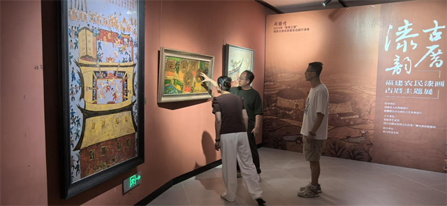 “古厝漆韵”主题福建农民漆画展同步举办,展览集中展示了30余幅福建农民漆画作品,多层面、多方位地将画作质朴率真的表现风格和福建古厝积淀的历史文化传递给现场观众,让观众沉浸式感受福建传统古厝与农民漆画的独特魅力。为推动农民漆画项目的高质量发展,现场邀请了闽疆两地农民漆画家,以创作回顾、学术交流等形式,开展“闽疆漆缘”——闽疆农民漆画创作沙龙,围绕进一步推动农民漆画实践和理论方面的相互融合进行深入探讨。